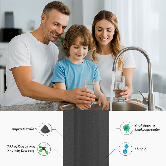Το φίλτρο συμπαγούς ενεργού άνθρακα με βακτηριοκτόνο δράση και επιφάνεια απορρόφησης άνω των 1100 τ.μ. ανά γραμμάριο, μειώνει το χλώριο, τα υπολείμματα απολυμαντικών, τα βαρέα μέταλλα και άλλες οργανικές χημικές ενώσεις για κορυφαία ποιότητα νερού, χωρίς μυρωδιές.