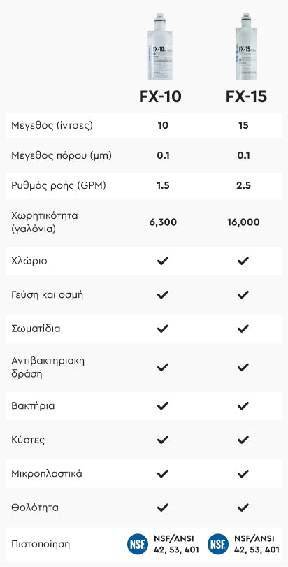 Κάθε 12 μήνες ή με βάσει τα λίτρα νερού, όποιο φτάσει πρώτο. Συγκεκριμένα, για το FX-10 30.000 και για το FX-15 60.567. Τα φίλτρα είναι υγειονομικού σχεδιασμού και η αντικατάσταση γίνεται με μια απλή περιστροφή του φίλτρου ¼, αφότου κλείσετε το νερό.
